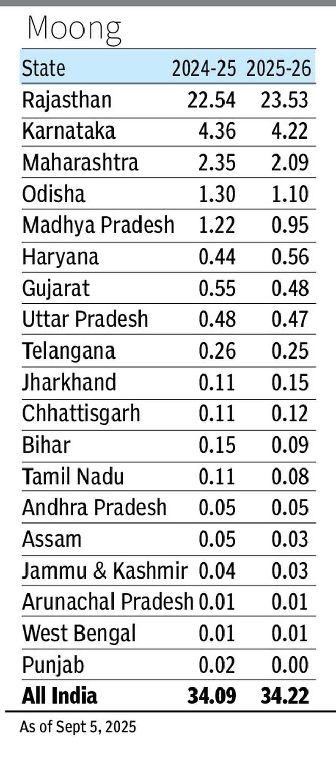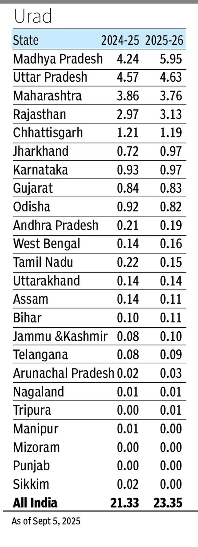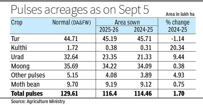 Farmers in Maharashtra have completed sowing of tur on over 12.23 lakh hectares as of September 11 — more than doubling last year’s coverage. Moong, however, has lagged, with sowing reaching only about 70 per cent of last year’s area. Urad has performed better, crossing its average acreage with cultivation on 3.77 lakh hectares, or 97 per cent of the State’s urad area. Overall, sowing of pulses in the State has touched 97 per cent of the season’s target.
