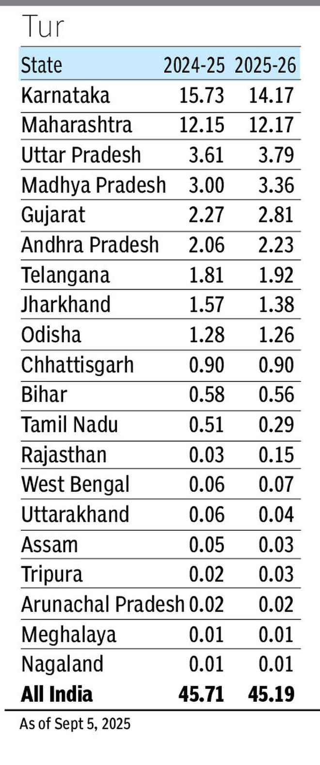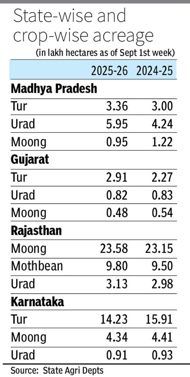 Rahul Chauhan of IGrain India estimates the tur production during kharif 2025 to be less than 30 lakh tonnes due to a dip in area and crop losses in Karnataka and Maharashtra. Moong production is likely to be around 17 lakh tonnes, while urad output will be lower at around 12 lakh tonnes, as excess rain in the Bundelkhand region that spans across MP and UP has impacted the crop severely.