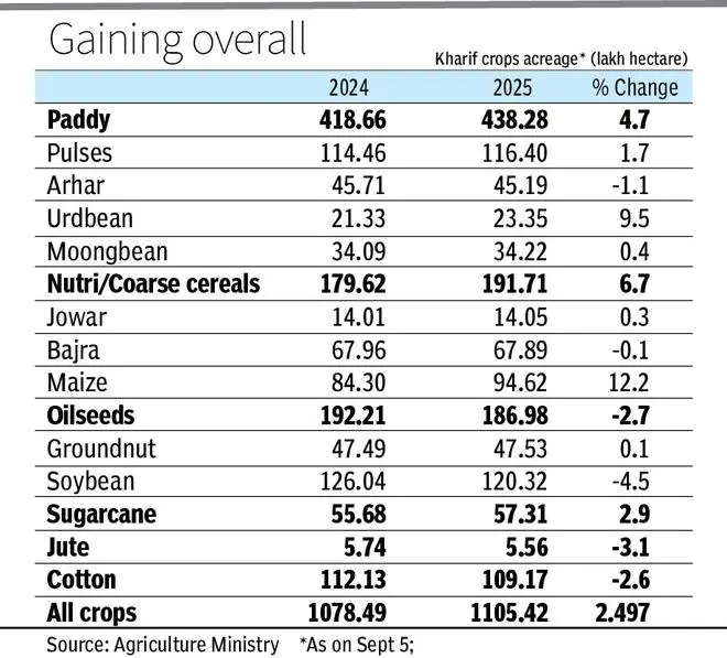 The area coverage under the kharif season’s main cereal paddy has reached 438.28 lh from 418.66 lh a year ago, which is 4.7 per cent higher while that of pulses reached 116.40 lh from 114.46 lh year-ago.