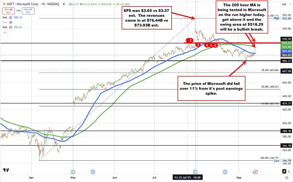 Technically, Microsoft’s price has reclaimed its 100-hour moving average at $503.49 and is now testing the 200-hour moving average at $512.27. So far, today’s high has reached $512.45, just above that key resistance. A sustained break above the 200-hour moving average would signal further upside momentum, with the next target at the swing level of $518.29.