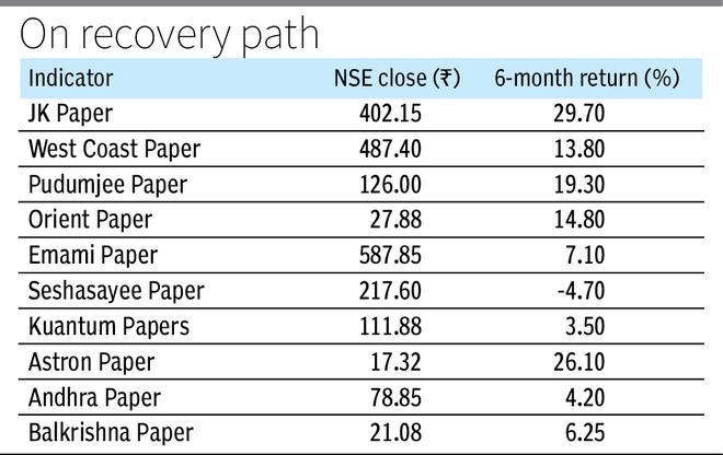 Shares of JK Paper ended Monday at ₹396.95 ( down 0.92 per cent from its previous close) but yielded a 6-month return of 27.8 per cent. Star Paper Mills closed the day at ₹176, with a 0.11 per cent gain while its 6-month return of 5.25 per cent. Seshasayee Paper & Boards traded at ₹267 (0.34 per cent) but fell around 6 per cent in the last six-month period. The dark horse is Emami Paper Mills, which was at ₹103.50 (up 0.29 per cent) and is nearing its 52-week high of ₹131. The stock gave a 6-month return of 7.97 per cent.