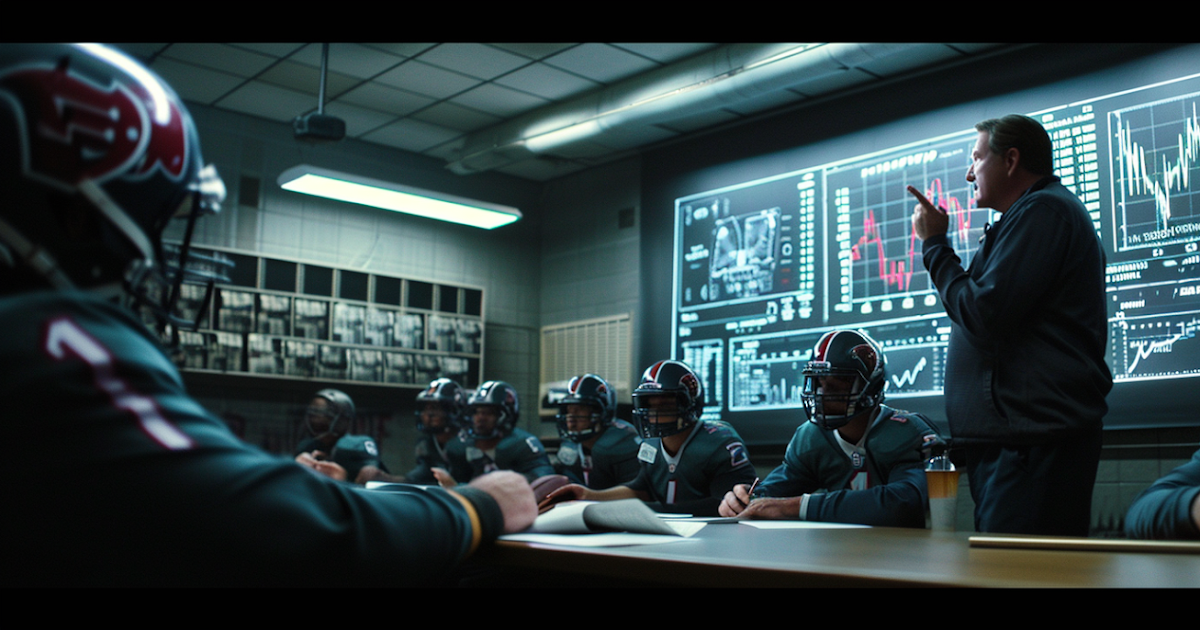 A NFL coach giving a half time talk to his player. Stock Chart are in the background