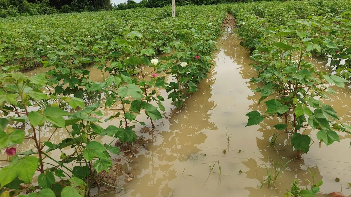 Karnataka Yadgir Rain water is being stagnated between lines of a cotton field in a village in Yadgir district owing to copious rains.