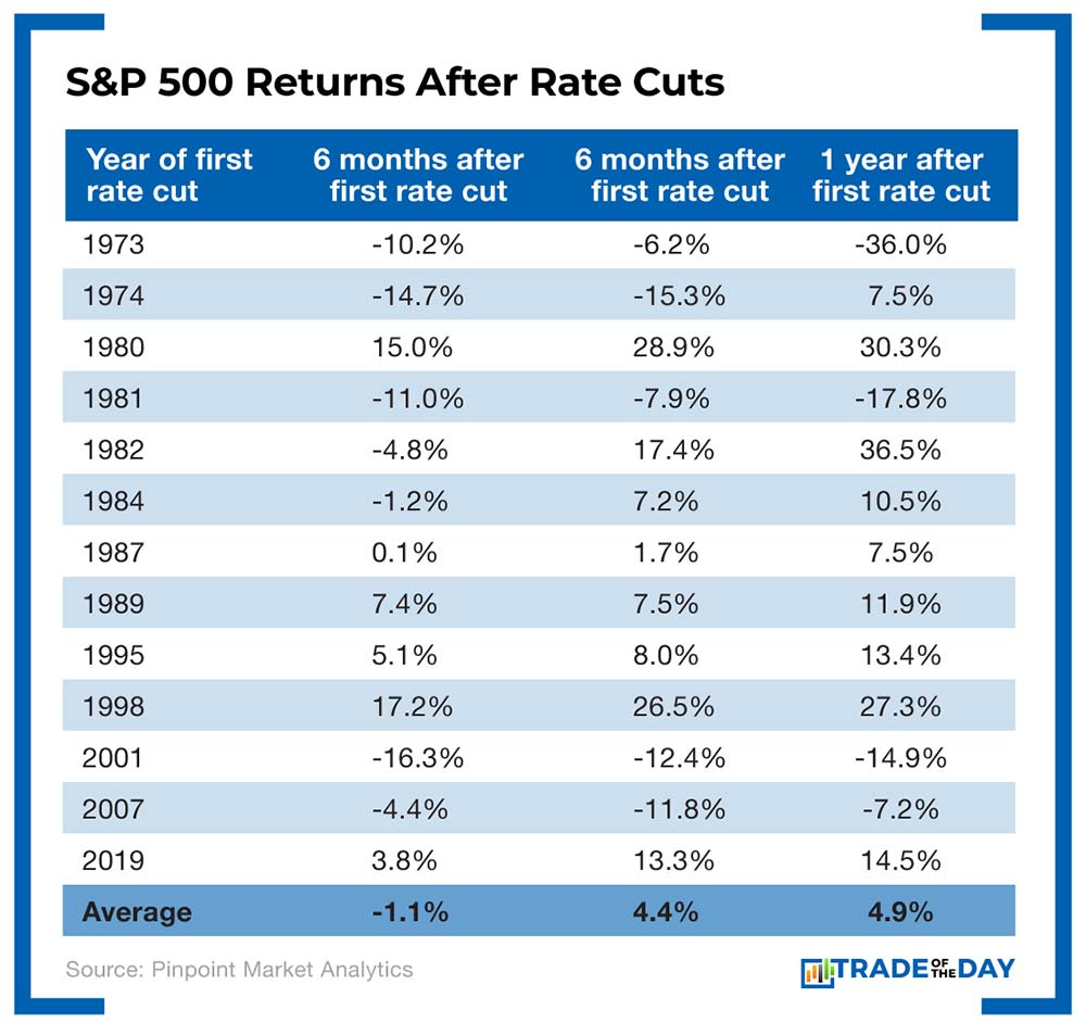 Dating back to 1973, the S&P 500 has averaged a -1.1% return 3 months after the first rate cut.