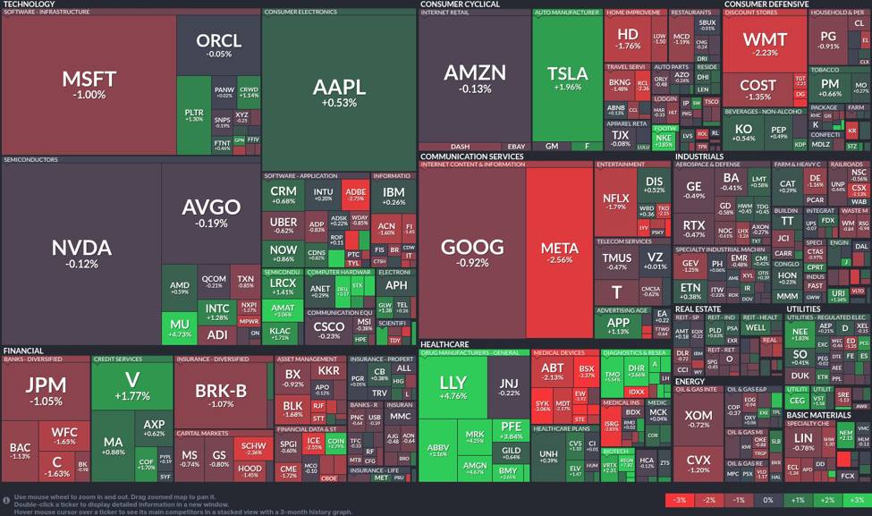 Conversely, the Consumer Cyclical and Communication Services sectors show significant losses, with Tesla (TSLA) as an exception gaining 1.96%. Google (GOOG) and Meta (META) are in the red, dropping by 0.92% and 2.56% respectively.