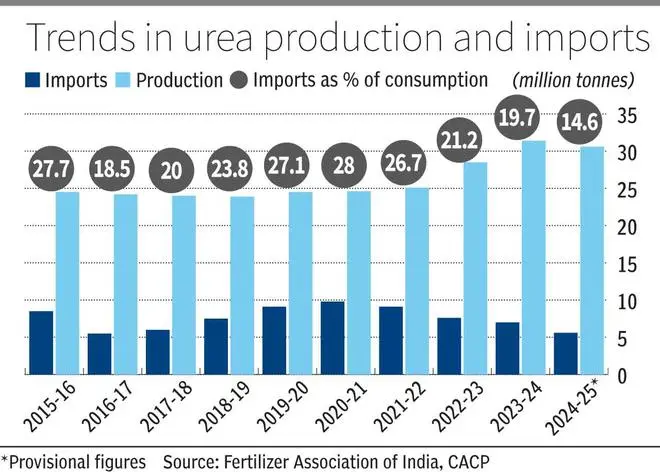 Between 2015-16 and 2023-24, India’s urea production increased from 24.5 million tonnes (mt) to a record 31.4 mt, but marginally declined to 30.6 mt in 2024-25. On the other hand, imports declined from 8.5 mt in 2015-16 to 5.6 mt in 2024-25, after reaching a peak of 9.8 mt in 2020-21. The share of imports in total urea consumption has declined from 27.7 per cent in 2015-16 to 14.6 per cent in 2024-25.