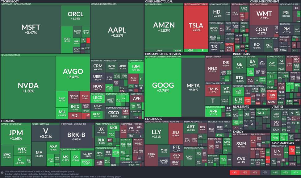 Meanwhile, the consumer cyclical sector is showing resilience, driven by Amazon (AMZN)‘s climb of 1.02%. However, not all companies are riding this wave; Tesla (TSLA) experiences losses, down by 2.20%, highlighting investor caution in the auto manufacturing space.