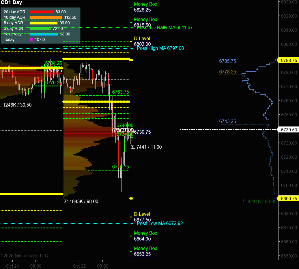 The morning flow saw bids fading and sellers pressing, forcing ES into a Cycle Day 1 Decline all the way to 6694 (prior CD1 Low), completing the projected downside range to the tick. As PTGDavid aptly noted — “Ran the full cycle range…”