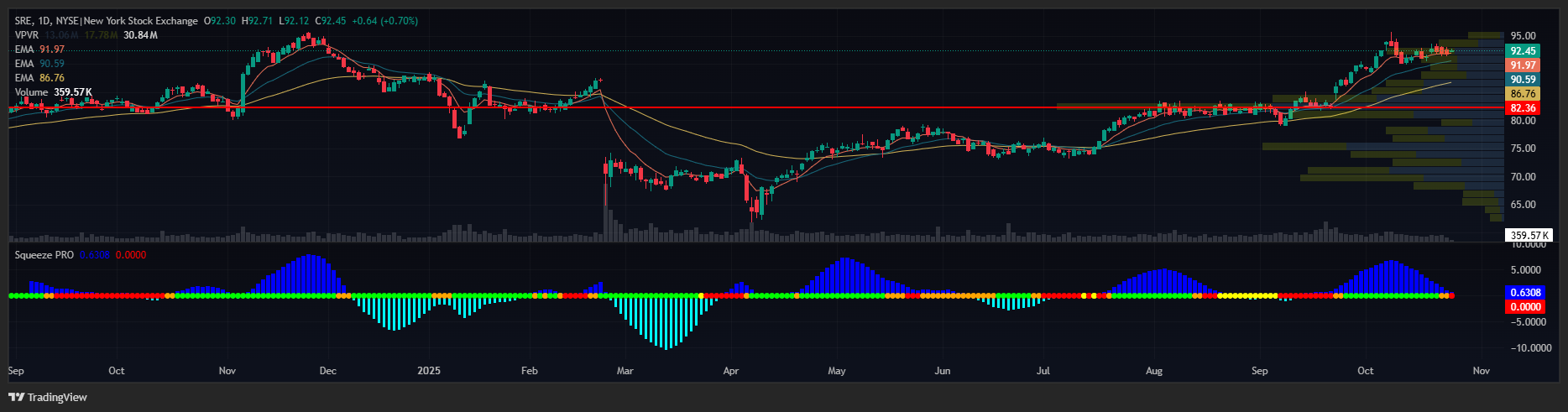 On SRE, I’m seeing the 9, 21, and 50 EMAs all stacked bullishly on both the daily and weekly charts.