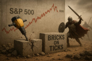 The S&P 500 (ES) now sits at a structural inflection point, having probed the 6650–6690 zone twice without printing so much as a token daily higher-high close. This is the classic setup for what I call “Bricks on Ticks” — each rally attempt gets weighed down by another metaphorical cinderblock as persistent sellers keep hammering the auction lower.